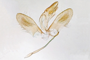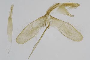 Aedeagus von Monopis laevigella länger als von Monopis weaverella, mit deutlichen Cornuti an der Aedeagus Spitze, Anellus ausgeprägter, die Valven etwas breiter und gedrungener als bei Monopis weaverella. Bei dem Präparat von Diagnosefalter 2 scheint am Anellus dessen Spitze bei der Präparation verletzt worden zu sein.