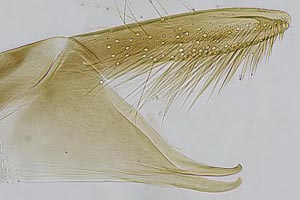 ♂ Genitalien: Bei M. weaverella Valve proximal am schmalsten und vor der Mitte am breitesten, der Schuppenbusch auf der Innenseite proximal gerichtet und den Costalrand überragend. Bei M. laevigella Valve fast parallelseitig, der Schuppenbusch nicht den Costalrand überragend.