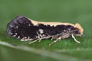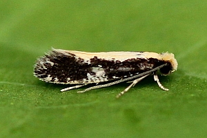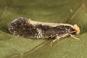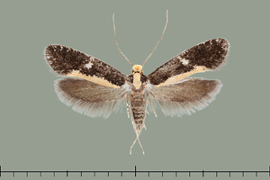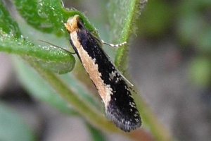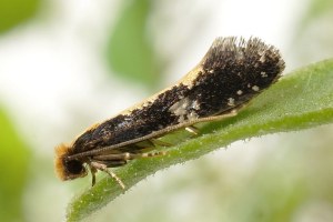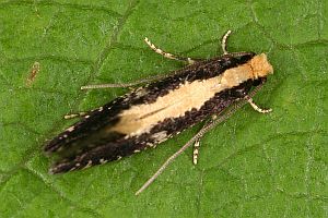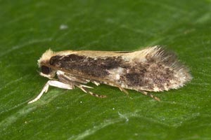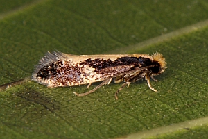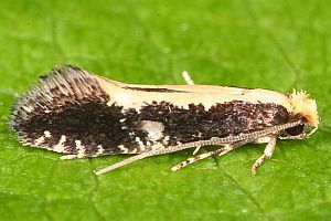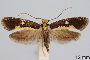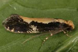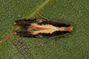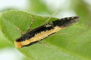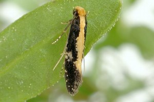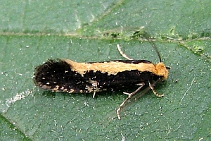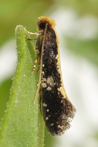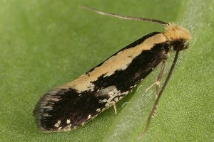 Monopis obviella: Hinterrandstreifen der Vorderflügel und Stirnschopf goldgelb, glänzend. 10-12 mm; Grundfärbung der Vorderflügel wenig variabel, meist ziemlich dunkelbraun.