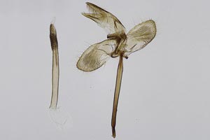 Monopis crocicapitella: Hinterrandstreifen der Vorderflügel und Stirnschopf cremefarben bis hellbraun. 12-16 mm; Grundfarbe der Vorderflügel wenig variabel, meist wesentlich heller als bei Monopis obviella.