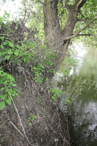 1: steile Böschungskante, Raupe an den unteren Trieben der Kratzbeere ca. 0,5 m von der Wasserkante entfernt, Deutschland, Niedersachsen, Fluss Oker bei Walle, Landkreis Gifhorn, 61 m, 30. April 2013 (Foto: Wolfgang Rozicki)Forum