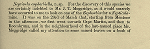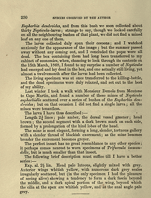 Die Minen mit den Raupen aus denen sich die Falter für die Erstbeschreibung entwickelten wurden nach Stainton (1869: 229-230) am 23. März 1867 bei Roccabruna (Italien, Piemont) an Euphorbia dendroides gesammelt. Bis in den Herbst hinein schlüpfte allerdings nichts. Bei einer Nachschau am 15. März 1868 - fast ein Jahr nach dem Fund der zahlreichen Minen - lagen diverse tote Falter aber auch noch ein lebendes Tier im Zuchtgefäß.
