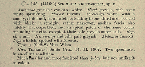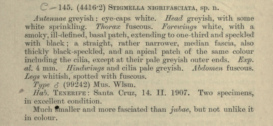 Die beiden Falter der Typenserie wurden von Walsingham am 14. Februar 1907 bei Santa Cruz de Tenerife (Kanarische Inseln) gefangen. Nach Klimesch (1972) werden sie im BMNH aufbewahrt.
