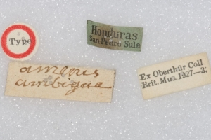 10-12: Lectotypus ♂ von Amenis proxima Mabille & Boullet, 1908, Daten siehe Etiketten (fot.: Nick V. Grishin, Fotos bearbeitet: Michel Kettner), coll. Muséum national d'histoire naturelle. Paris.