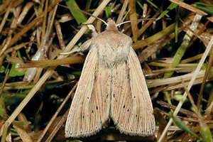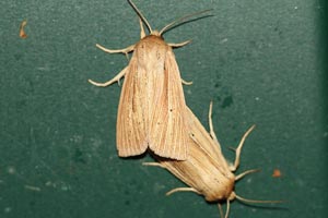 Unterscheidung Mythimna impura und Mythimna pallens: Mythimna impura hat auf der Rückenbehaarung entlang des Ansatzes der Tegulae immer eingestreute schwarze Strähnchen, die bei Mythimna pallens fehlen. Farbe der Hinterflügeloberseite: