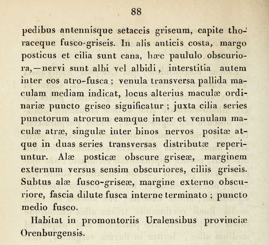 - Erstbeschreibung: Eversmann, E. (1846): Lepidoptera quaedam nova in Rossia observata. — Bulletin de la Société Impériale des Naturalistes de Moscou 19 (3): 83-88, pl. I-II.