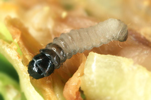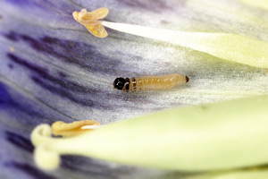 Die Jungraupen leben anfangs am Grund der Blüten zwischen Blütenkelchblättern und Stempel, den sie benagen. Der Befall durch Raupen ist an den Blüten äusserlich schwer feststellbar. Nach einiger Zeit bauen sie sich schützende Säcke, welche sie bis zur Puppenzeit tragen werden, und verlassen die Blüten, um von jetzt an in der Bodenstreu zu leben. Im Gegensatz zu den Psychiden oder Coleophoriden benutzen die Raupen beide Öffnungen des Sackes mal als Vorder- mal als Hinterende. Dies geschieht oft in raschem Wechsel. Vermutlich wird der Jugendsack zu einem guten Teil aus dem gelblichen Kot der Jungraupe verfertigt.