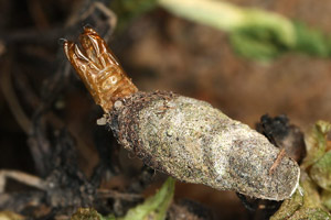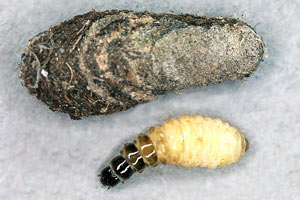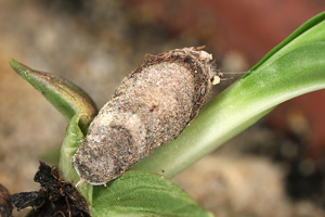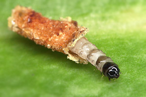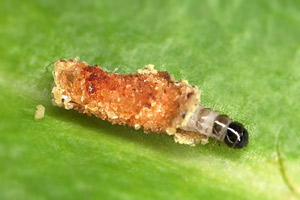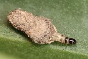 Nach der Überwinterung wollten die Raupen ab Ende Februar nochmals gewaltig viel fressen und verzehrten die jungen und noch kleinen Sprösslinge der Nahrungspflanze mit Stumpf und Stiel. Die Raupen erweiterten in dieser Zeit auch ihre Gehäuse. Diese erhielten jetzt eine langgestreckte Birnenform von 10-12 mm Länge.