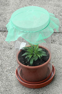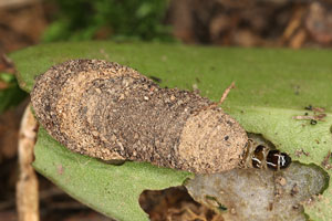 Im anfänglichen Zuchtgefäss benagten die Raupen die gereichten Enzianblätter und -blüten und hatten ihre Säcke vergrössert und umgebaut. Faserige Pflanzenteile und Blattstückchen bildeten das Baumaterial. Einige Tage nach Umsiedlung der Räupchen in "Blumentopf-Zuchtgefässe" (siehe unten) waren die Pflanzenfasersäcke aller Raupen bereits wieder umgebaut. Birnförmige Erdsäcke von 3-4 mm Länge waren an ihre Stelle getreten. Danach nimmt die Grösse der Säcke zu, die Form und das Material bleiben aber gleich. Der fertige Raupensack hat eine Länge von 7 mm. Nach wie vor werden von der Raupe sowohl das schmalere wie auch das breitere Ende der Behausung als Kopfende verwendet. Die Raupen leben am Boden unter den aufliegenden Blättern und befressen diese von unten. Sie leben so versteckt, dass sie selbst im kleinen Raum des Zuchtgefässes nicht ohne weiteres gesehen werden.
