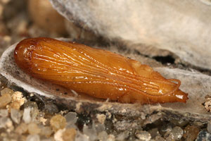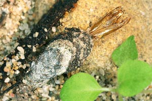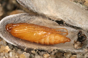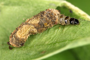 1-3, sackloses Frühstadium (1-2 mm): 14. Juli 2011. Besonderes Kennzeichen - ein auffälliger Wulst auf dem 8. Hinterleibssegement (Bild 3).