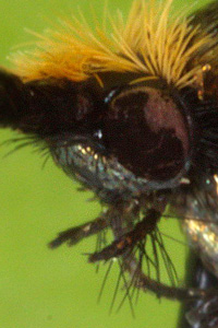 Die Fühlerbasis ist bei dieser Art beschuppt und der Haarschopf hinter den grossen Augen ist goldgelb. (Rudolf Bryner)