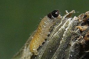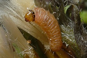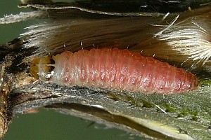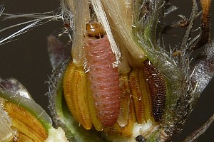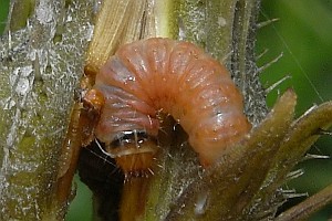 Kennel (1913: 270-271) hatte zusammengetragen: "Die Raupe ist rötlichbräunlich, der Kopf hellbraun, das Nackenschild gelb, hinten schwarz punktiert; sie lebt im August und September in den Samenköpfen von Picris hieracioides und den Blüten von Crepis."