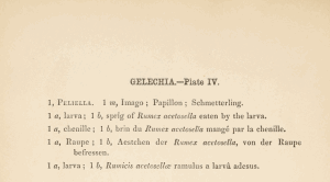 - Stainton, H. T. (1865): The natural history of the Tineina 9: [I-VII], 1-276, Gelechia pl. I-VIII. London (John van Voorst) – Paris (Deyrolle) – Berlin (E. S. Mittler und Sohn). — Digitalisat auf archive.org: [106-115], [pl. IV fig. 1].