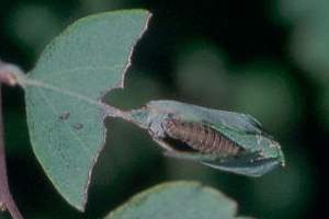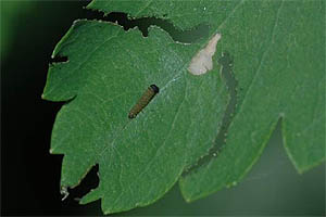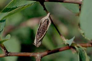 Die Art bildet im Jahr nur eine Generation aus, die je nach lokalem Klima und Höhenlage vereinzelt schon ab Ende Mai, meist aber erst ab Mitte Juni bis Mitte August fliegt. Das ♀ legt seine Eier einzeln an die Blattoberseite von Wald-Geißbart (Aruncus dioicus), Echtem Mädesüß (Filipendula ulmaria) und verschiedenen Spierstrauch-Arten (Spiraea-spp.), hierunter auch angepflanzte Ziergehölze. Die schlüpfende Raupe fertigt an der Blattspitze eine kleine Blatttüte und verlässt dieses Sommerquartier nur zum Fressen. Nach der zweiten Häutung wird im Oktober ein größeres Überwinterungsgehäuse ebenfalls aus einem Blatt gefertigt. Im April verlässt die Raupe dieses wieder und lebt nun frei, aber durch ihre bizarre Form bestens getarnt, an der Nahrungspflanze. Sie verpuppt sich im Mai oder Juni.
