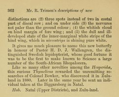 - Erstbeschreibung: Trimen, R. (1883): Descriptions of twelve new species of South-African Lepidoptera-Rhopalocera. — The Transactions of the Entomological Society of London for the Year 1883: 347-363. — Digitalisat auf biodiversitylibrary.org: [361]