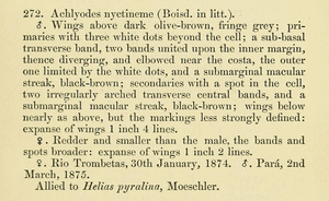- Erstbeschreibung: Butler, A. G. (1877): On the Lepidoptera of the Amazons, collected by James W. H. Trail, Esq., during the years 1873 to 1875. — The Transactions of the Entomological Society of London for the Year 1877 (2): 105-156, pl. III. — Digitalisat auf biodiversitylibrary.org: [155]