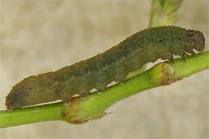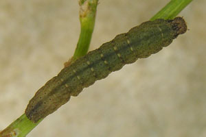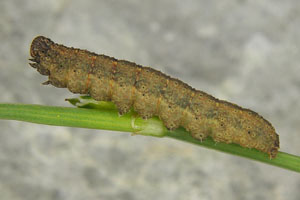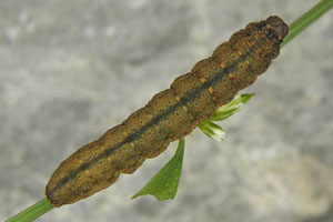 Charakteristisch für die nodosalis-Raupe ist der deutliche dunkle Rückenstreifen. (Stefan Ratering) [Forum]