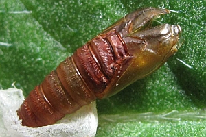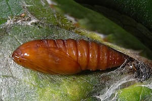 Die Liste von Schütze (1931) dürfte auch Falschangaben enthalten: "Zwischen zwei zusammen gesponnenen Blättern von Rosa, Quercus, Crataegus, Rubus fruticosus, Prunus spinosa. Verwandlung in der Wohnung (Sorhagen)."