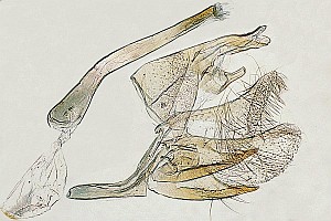 1-2: Genitalpräparat des als Lebendfalter 1-3 abgebildeten ♂, Funddaten siehe oben (Einbettung und GP-Fotos: Hans-Peter Deuring). Anmerkung zum Genital: Die untere Valve ist an ihrer Basis leicht eingerissen und etwas eingeklappt. Ohne diese Blessur würde sie wie die obere aussehen.Forum
