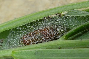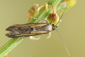 Die Raupen leben in versponnenen Triebspitzen von Thesium-Arten. Im Berner Jura (Schweiz) wurden die Falter jeweils in unmittelbarer Umgebung von Pyrenäen-Leinblatt (Thesium pyrenaicum) gefunden (Rudolf Bryner). Im Kyffhäuser-Gebirge (Deutschland, Thüringen) leben die Raupen an Thesium linophyllon (Heidrun Melzer). (Text: Heidrun Melzer)