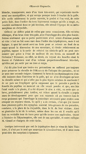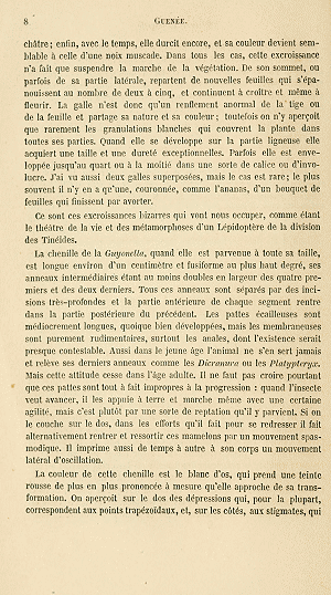 Coutin (1995: 11) ergänzte dann sehr präzise: "Tout récemment, un ami qui rentrait de Tunisie m'a commumque un rameau de Limoniastrum monopetalum provenant de la région de Djerba et qui portait des galles, ce qui m'a remis en mémoire que j'avais découvert jadis avec la même surprise ce même type de déformation spectaculaire. [...] D'abord découverte dans la région de Biskra (Algérie) sur Limoniastrum guyonianum Durieux, plante saharienne, cette galle a été observée depuis à plusieurs reprises en Tunisie dans la région de Sousse sur Limoniastrum monopetalum (L.) Boissier in D.C., qui, à la différence du précédent, pousse dans les zones marécageuses maritimes de la Méditerranée occidentale (Baléares, Crête, Espagne, France, Italie, Portugal, Sardaigne, Sicile). Il s'agit d'une déformation ovoïde, de la grosseur d'une olive, qui se forme donc sur les tiges florifères du Limoniastrum guyonianum et du L. monopetalum. Ce genre ressemble à un Limonium; ils appartiennent tous les deux à la famille des Plumbaginaceae. [...] La femelle d'Oecocecis guyonianum insère chacun de ses œufs dans une blessure longitudinale, réalisée dans un pédoncule floral, à l'aisselle d'une feuille, avec son ovipositeur en forme de courte lame tranchante. L'œuf se trouve enrobé de sève. Après l'éclosion, chaque chenille provoque, probablement sous l'action de sa salive et de faibles mordillements, la prolifération des tissus voisins et le développement anormal des cellules des parois internes de la galle. Celle-ci, d'abord molle, durcit et acquiert une consistance ligneuse. En fendant la galle, on trouve à l'intérieur la chenille, de couleur blanc-jaunâtre, elle mesure 10 mm à la fin de sa croissance qui dure 8 mois environ, d'avril au mois de novembre. Avant de se nymphoser, la chenille découpe une partie de l'épaisseur de la paroi de la galle en forme de petit orifice circulaire, en ne respectant que l'épiderme, de sorte que ce "trou" reste invisible de l'extérieur, permettant cependant au papillon de forcer ultérieurement le passage pour s'échapper à l'extérieur au printemps suivant."