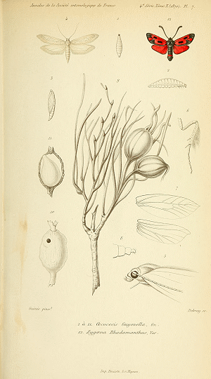 - Coutin, R. (1995): A propos d’une curieuse galle de tige de Limoniastrum provoqué par la chenille d’une Teigne (Lepidoptera, Tineidae). — Insectes, 97 (2): 11. [PDF auf insectes.xyz]