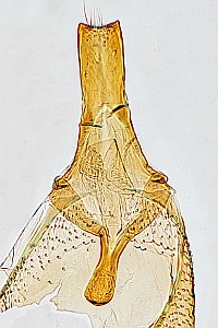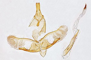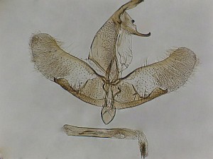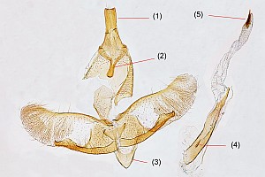 3-6: Genitalpräparat des unter Lebendbild 2-3 abgebildeten ♂, Funddaten siehe Falterbild 2-3 (gen.präp., det. & Fotos: Hans-Peter Deuring) Erläuterungen zu Bild 3-5: 3 = Genital, 4 = Uncus und Gnathos, 5 = Cornutibüschel am Ende der Vesica Erläuterungen zu Bild 6, Genital-Merkmale von Oegoconia caradjai nach Huemer (1998): - Uncus auffallend breit, distal ausgeschnitten (1) - Gnathos ca. 1/2 der Uncusbreite (2) - Saccus sehr breit (3) - extrem kurzer Sklerit in der Vesica (4) - dornenförmige Cornuti in einem einzelnen terminalen Büschel angeordnet (5)Forum