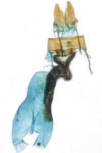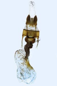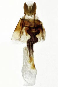 Genitalien Weibchen: Lamina antevaginalis breit. 7. Sternit mit schmalem, tiefem U-förmigem Einschnitt. Sklerotisierung („Signum“) groß, langgestreckt, manchmal zweigeteilt. Ductus bursae vor der Mündung beidseitig breit erweitert, bursawärts mit einer Ausbuchtung nach rechts.