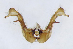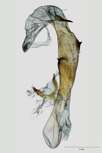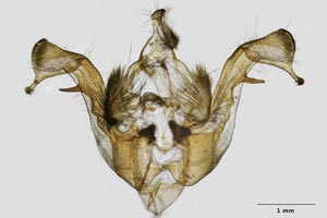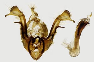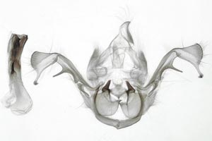 Genitalien Männchen: Clavus mäßig lang mit erweiterter, deutlich abgesetzter Basis. Ampulla („Harpe“, „Clasper“) lang, in der äußeren Hälfte gleichbleibend schmal, Spitze abgerundet. Cucullus groß mit langem, schlankem Fortsatz.