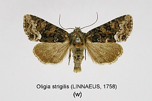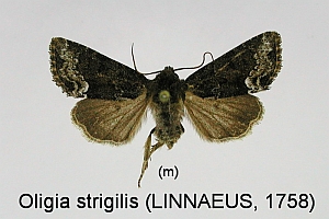 Durchschnittlich größte Art der Gattung. Äußere Querlinie über dem Vorderflügel-Hinterrand meist stark nach innen gebogen, oft als deutlich abgerundeter Knick. Von der Querlinie aus springen entlang der Adern meist deutliche, kräftige, schwarze Zähnchen ins Saumfeld vor. Auch bei Oligia strigilis kommen häufig schwarzbraun oder schwarzgrau bis schwarz verdunkelte Formen vor, die aber anhand des Querlinienverlaufs (sofern erkennbar) und ihrer bedeutenderen Größe oft noch bestimmt werden können. Abgeflogene Tiere, abnorm kleine Falter oder dunkle Formen, bei denen die äußere Querlinie nicht auszumachen ist, sind nur nach genitalmorphologischen Merkmalen identifizierbar. Text: Axel Steiner
