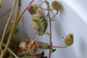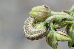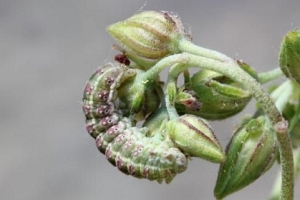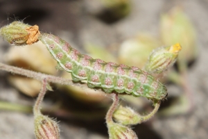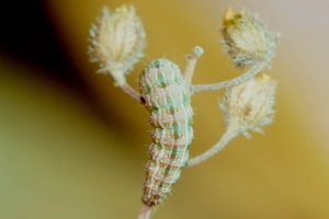 Bachelard et al. (2008: ) diskutieren die Raupennahrung: "La description de la chenille, réalisée pour la première fois par Chrétien (1926), a été reprise par Berio (1985) et Dantart & Perez de Gregorio (1989). [...] Nous avons trouvé à plusieurs reprises des chenilles sur des hélianthèmes à fleurs jaunes (Helianthenum nummularium L. et H. oleandicum [sic!] ssp. incanum Wilk.). Helianthenum nummularium L. est d’ailleurs cité par Moulignier (1989) comme plante-hôte. Ces hélianthèmes sont assez communs et poussent sur les talus, les pelouses rases, les rochers sur sol calcaire … La chenille se nourrit des graines de la plante-hôte qu’elle perfore. Elle mesure au terme de sa croissance entre 2 et 2,3 cm, et devient légèrement brunâtre avant la nymphose. La chrysalidation s’effectue juste sous la surface du sol dans un petit cocon ovoïde confectionné avec de la terre et des débris de végétaux. Une description très détaillée de la chenille et de la chrysalide a été faite par Chrétien (1926). Cet auteur donne même les critères discriminants avec Omia cymbalariae."