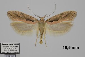 1: ♂, Spanien, Kanarische Inseln, Fuerteventura, 1 km W Lajares, 75 m, 28°40'44''N, 13°57'22''W, 26. Februar 2020, am Licht (leg. & fot.: Egbert Friedrich), leg. & det. Egbert Friedrich & Petra Peuker, conf. Andreas Werno, ID: Bild EF17111-46, GU1927, Referenz: Medvedev (1990), 982, Abb. 5 & 6 oder Opredelitel Nasekomykh Evropeyskoy Chasti CCCR,Tom IV, Vtoraia Chast', Seite 720, Abb. 5 & 6, Leningrad, 1981, Medvedev, G. S. (Editor)Forum