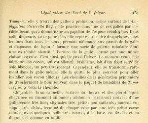 Schon Chrétien (1917: 474-475) schrieb in seiner Erstbeschreibung auch einiges über Details der Lebensweise der Raupe an Tamarisken in Nordafrika. Die genaue Art wurde leider nicht genannt.