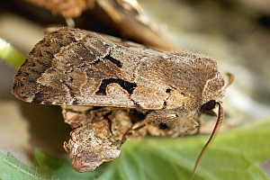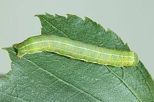 - Phlogophora meticulosa: die Haut wirkt durchsichtig, die Zeichnung ist unscharf marmoriert; Rückenlinie unterbrochen.