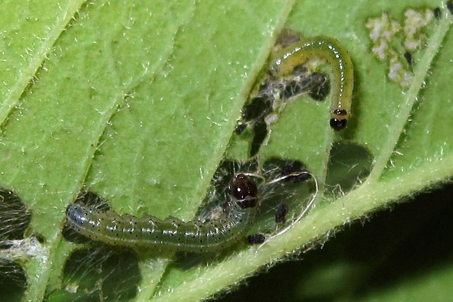 5-7: zwei Jungraupen (verschiedene Stadien), Deutschland, Niedersachsen, Landkreis Gifhorn, Leiferde, Brache am Stadrand, ca. 60 m, in versponnener Triebspitze von Beifuß (Artemisia vulgaris), 3. Juni 2013 (Fotos: Tina Schulz), det. Heidrun MelzerForum
