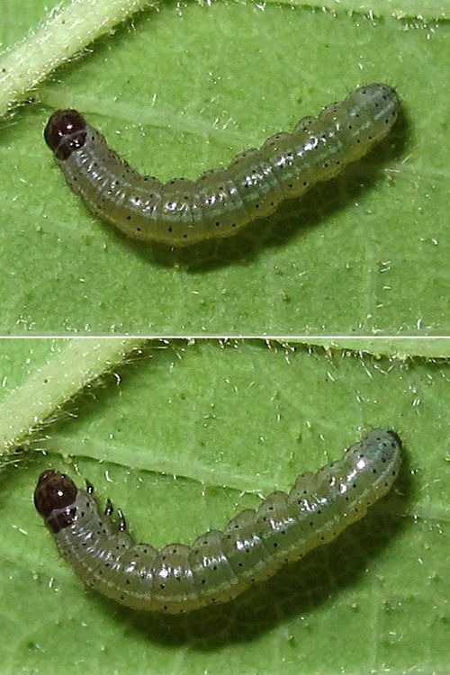 1-2: 11 mm lang, Österreich, Niederösterreich, 2,5 km N Schwarzau am Steinfeld, lichtungs- und laubholzreicher Schwarzföhrenforst, versponnen in einem Blatt von Kratzbeere (Rubus caesius), 3. Juni 2006 (Fotos: Peter Buchner), det. Peter Buchner
