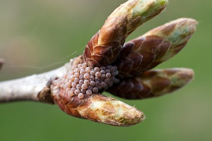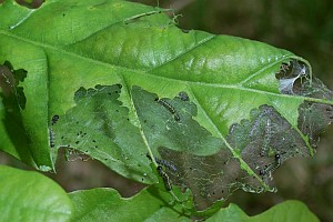 1, Befallsbild an Eiche (Quercus spec.) mit Eiraupen: Deutschland, Bayern, 89346 Bibertal, Bubesheimer Wald, 490 m, 9. Mai 2013 (Freilandfoto: Jürgen Quack)[Forum]