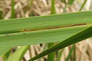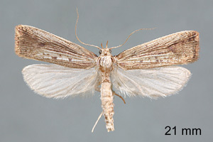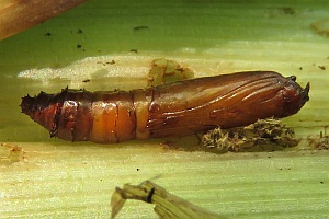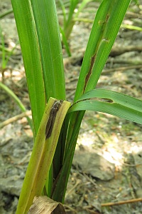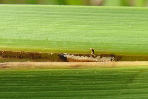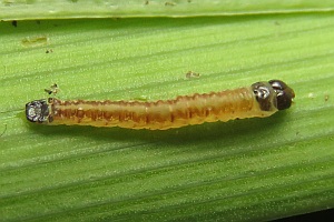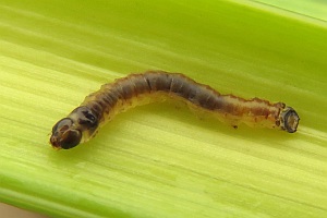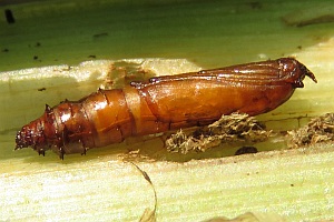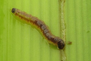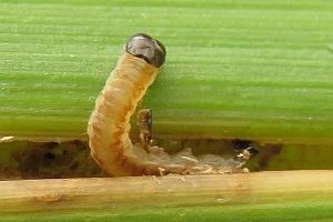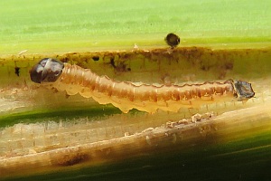 Schütze (1931: 16) fasst den damaligen Kenntnisstand zur Raupe zusammen: "Fand ich zahlreich im Stängel von Iris pseudacorus, dicht über der Wurzel, Kliewer in den Herzblättern von Sparganium ramosum [Sparganium erectum]. Lebt auch an Scirpus lacustris [Schoenoplectus lacustris], Glyceria spectabilis [Glyceria maxima], Sparganium simplex [Sparganium emersum], jung von zarten Blättern, später im Stängel oberhalb der Wurzel in einer Röhre; die abgestorbenen Herzblättern verraten sie (Sorhagen). Teich traf Raupen und Puppen zu Hunderten in Scirpus lacustris [Schoenoplectus lacustris]. Verwandlung in der Wohnung. Auch in Typha angustifolia (Kaltenbach)."