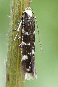 Die Unterschiede im männlichen Genital zwischen E. wilkella und E. superbella sind nicht gravierend. E. superbella ist jedoch etwa 1/3 kleiner und es fehlen die weißen Fühlerenden, wie sie bei E. wilkella zu sehen sind (im Bild leider nicht erkennbar, weil unter den Flügeln liegend). (Friedmar Graf)