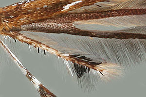 Merkmale: Vorderflügel rotbraun, Querstreifen weiss; schwarze Randbeschuppung der letzten Hinterflügelfeder am Vorderrand kürzer als am Hinterrand, wo sie einen markanten nach aussen abgeschrägten Schuppenzahn bilden. Text: Rudolf Bryner