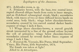 - Erstbeschreibung: Butler, A. G. (1877): On the Lepidoptera of the Amazons, collected by James W. H. Trail, Esq., during the years 1873 to 1875. — The Transactions of the Entomological Society of London for the Year 1877 (2): 105-156, pl. III. — Digitalisat auf biodiversitylibrary.org: [155]