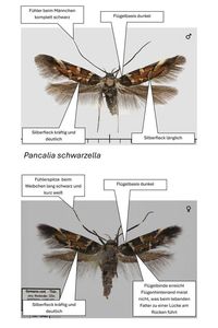 1: Auf guten Fotos lassen sich die ♀♀ der Arten sicher bestimmen. Bei Pancalia schwarzella und nodosella haben die Männchen komplett schwarze Fühler. Nach dem, was ich an Bildern gesehen haben, sollten sich anhand der angeführten Merkmale auch die ♂♂ einigermaßen bestimmen lassen (Thomas Guggemoos im [Forum], leicht verändert).
