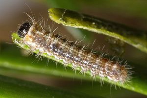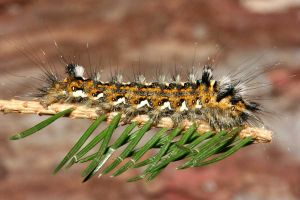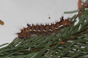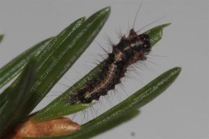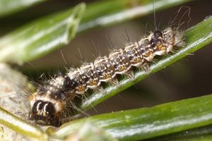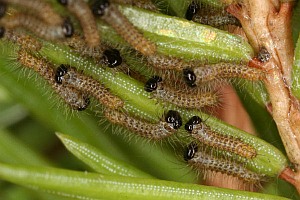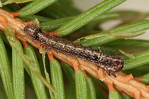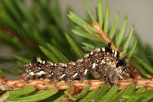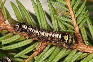 4: Jungraupe (ca. L3): Deutschland, Rheinland-Pfalz, Montabaur, Westerwald, Waldweg an Jungkiefer (Pinus sylvetris) 11. August 2007 (Studiofoto Rainer Wendt), conf. Markus Knust & Thomas FähnrichForum