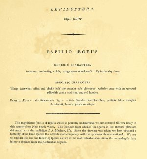 - Original description: Donovan, E. (1805): An Epitome of the Natural History of the Insects of New Holland, New Zealand, New Guinea, Otaheite, and other Islands in the Indian, Southern, and Pacific Oceans: Including the Figures and Descriptions of One Hundred and Fifty-Three Species of the more Splendid, Beautiful, and Interesting Insects, Hitherto Discovered in those Countries, and which for the most Part have not Appeared in the Works of any Preceding Author. The Figures are Correctly Delineated from Specimens of the Insects; and with the Descriptions are Arranged According to the Linnæan System, with Reference to the Writings of Fabricius and other Entomologists: I-IV; pl. [1]-[41]; unpaginated text pages. London.