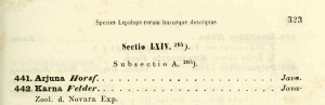 - Erstbeschreibung: Felder & Felder (1864): Species Lepidopterorum hucusque descriptae vel iconibus expressae in seriem systematicam digestae. — Verhandlungen der kaiserlich-königlichen zoologisch-botanischen Gesellschaft in Wien 14: 289-378. Wien (W. Braumüller).