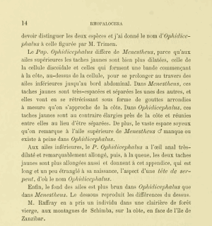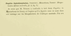 - Erstbeschreibung: Oberthür, C. (1878): Études d'entomologie. Faunes entomologiques descriptions d'insectes nouveaux ou peu connus 3. Étude sur la faune des lépidoptères de la côte orientale d'Afrique. i-x, 11-48, pl. I-IV. Rennes (Oberthür & Fils).