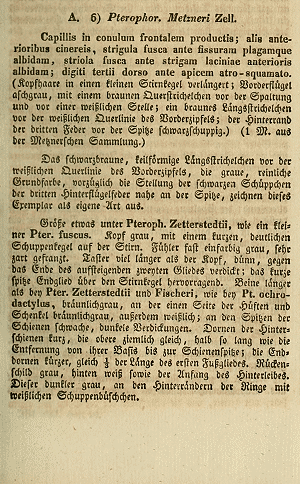 - Erstbeschreibung: Zeller, P. C. (1841): Vorläufer einer vollständiger Naturgeschichte der Pterophoriden, einer Nachtfalterfamilie. — Isis von Oken 1841 (10): 755-794, (11-12) 827-893, Taf. IV.