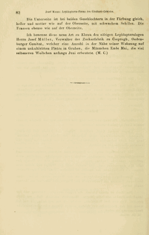 Mann (1871) teilt mit: "Ich benenne diese neue Art zu Ehren des eifrigen Lepidopterologen Herrn Josef Müller, Verwalter der Zuckerfabrik zu Csepregh, Oedenburger Comitat, welcher eine Anzahl in der Nähe seiner Wohnung auf einem unkultivirten Platze in Gruben, die Männchen Ende Mai, die viel selteneren Weibchen anfangs Juni erbeutete."