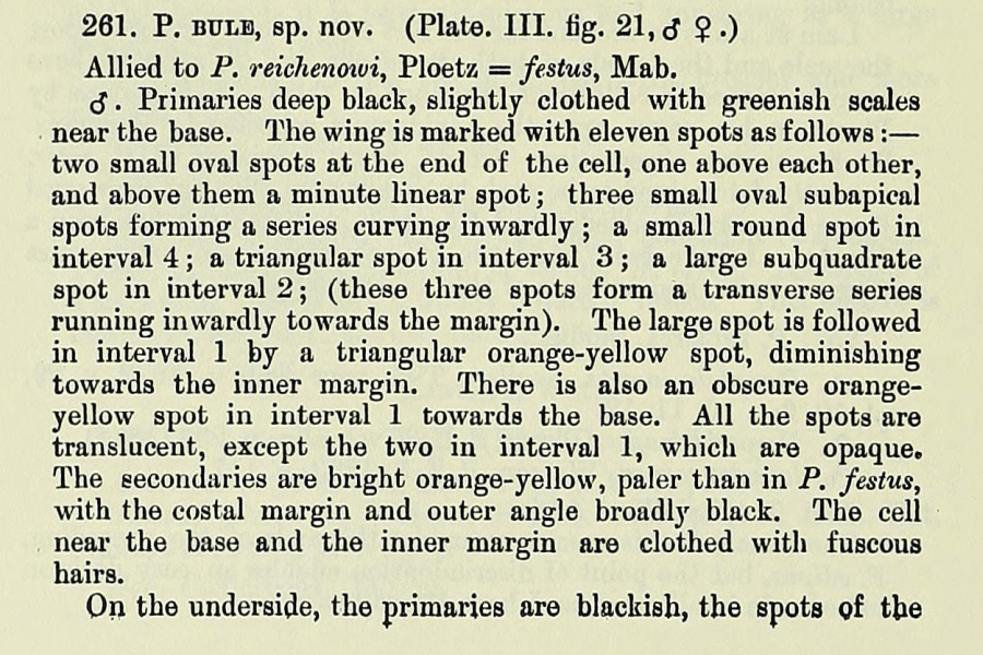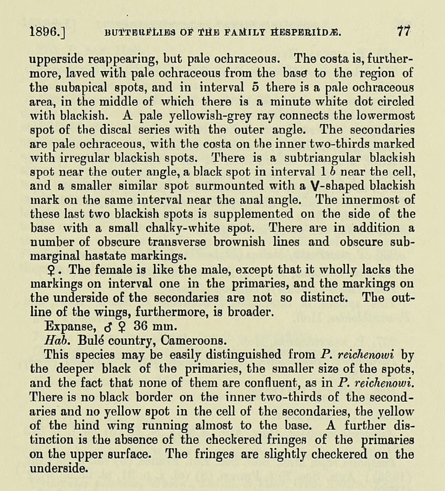 - Erstbeschreibung: Holland, W. J. (1896): A Preliminary Revision and Synonymic Catalogue of the Hesperiidae of Africa and the adjacent Islands, with Descriptions of some apperently new Species. — Proceedings of the General Meetings for Scientific Business of the Zoological Society of London for the Year 1896: 2-107, pl. I-V. — Digitalisat auf biodiversitylibrary.org: [76], [pl. III fig. 21]