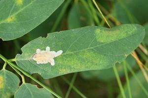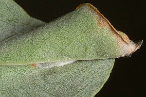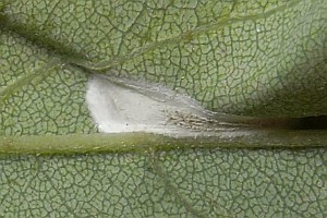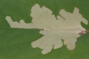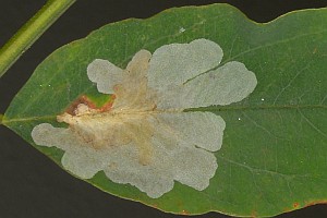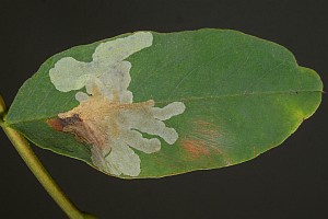 Die aus Nordamerika eingeschleppte Art ist in Europa nach bisheriger Kenntnis ganz auf die Robinie (Robinia pseudoacacia) beschränkt, in deren Blättern sie große, auffällige oberseitige Minen anlegt.